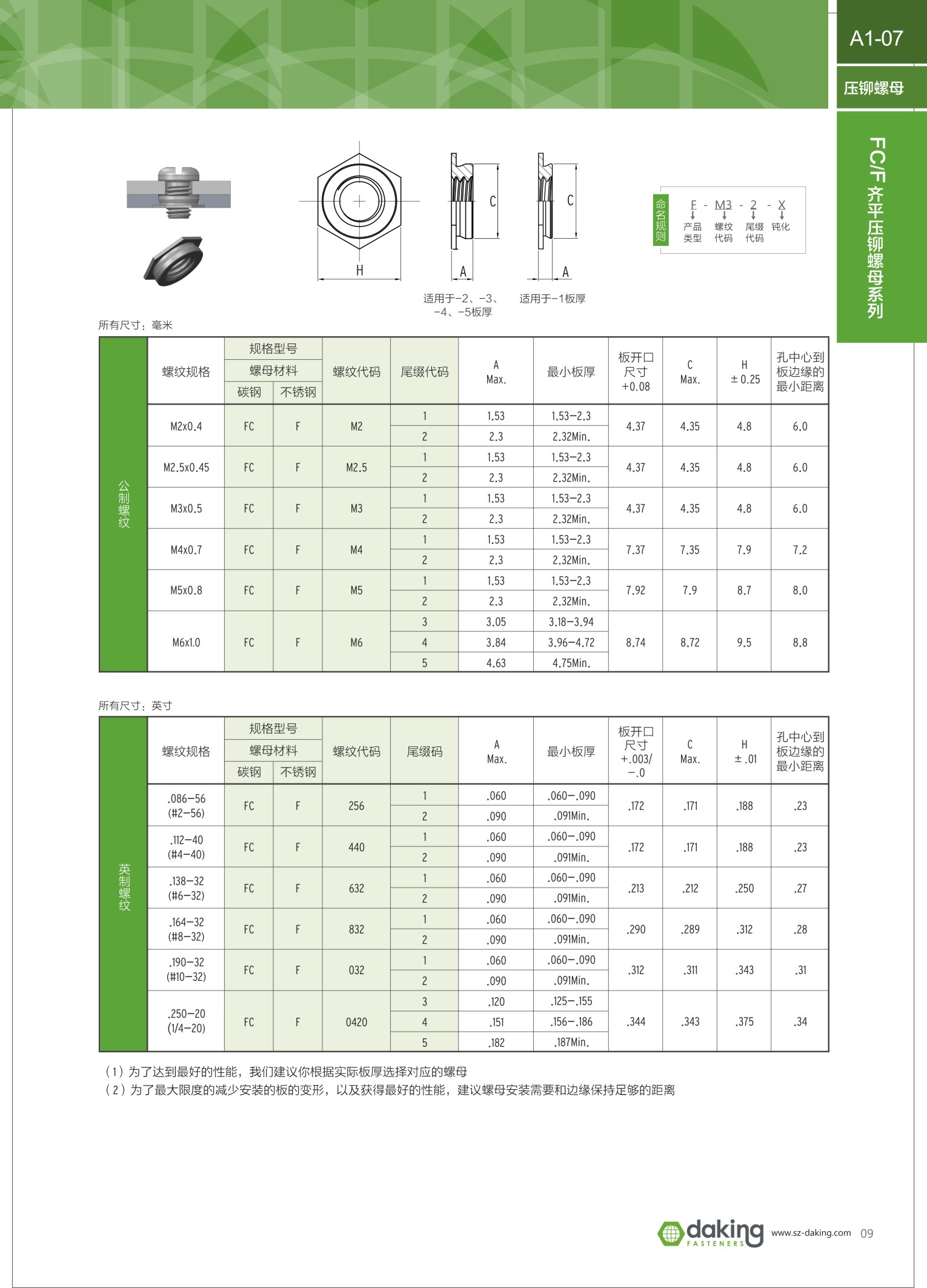 F 齊平壓鉚螺母,適合安裝在不低于1.5mm的薄板上,并且保持和薄板齊平,沒有任何凸起,可以提供比薄板抽孔攻牙螺紋更牢固的螺紋。