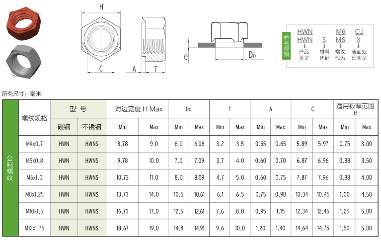 六角焊接螺母,外形是六角形,一面和六角螺母一樣,另一面有三個焊點和一個凸臺。三個焊點用于焊接,凸臺用于定位。首先在母體上沖出定位孔,把螺母的凸臺定位在孔上面,然后使用點焊機(jī)把螺母焊接在母體上。