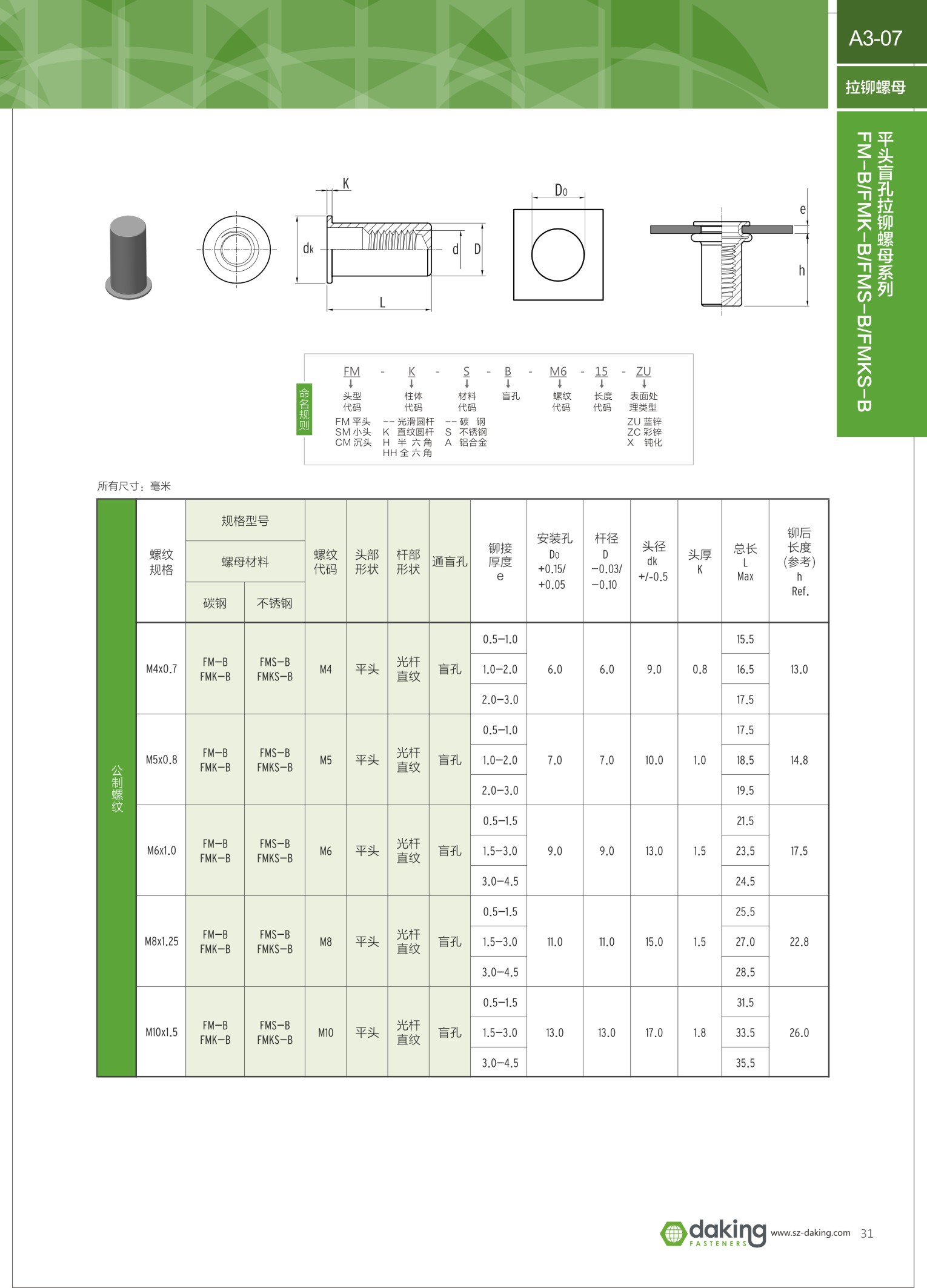 產(chǎn)品使用要求 拉鉚螺母的安裝我們推薦使用專用工具,采用下圖所示的“旋轉(zhuǎn)-拉鉚-旋轉(zhuǎn)”的安裝技術(shù)。安裝過程,鉚螺母首先被旋上芯軸,然后插入安裝孔,然后通過拉鉚使螺母變形,螺母緊密的和安裝板固定在一起,最后退出鉚螺母,完成安裝過程。