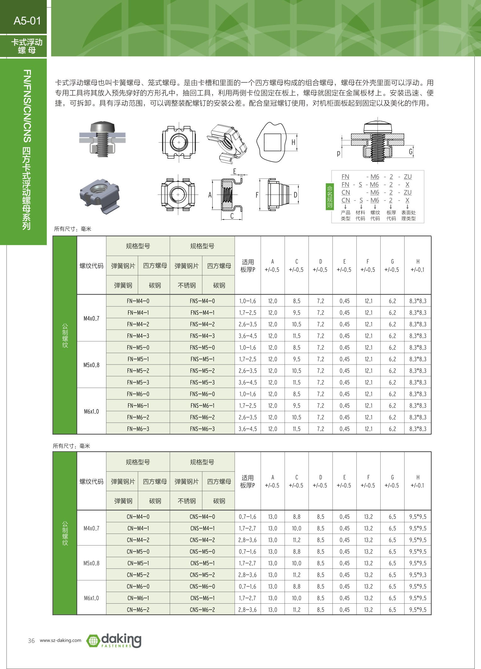 產(chǎn)品概述 卡式螺母也叫卡簧螺母、籠式螺母。是由卡槽和里面的一個四方螺母構(gòu)成的組合螺母,螺母在外殼里面可以浮動。用專用工具將其放入預(yù)先穿好的方形孔中,抽回工具,利用兩側(cè)卡位固定在板上,螺母就固定在金屬板材上。安裝迅速、便捷,可拆卸。具有浮動范圍,可以調(diào)整裝配螺釘?shù)陌惭b公差。配合皇冠螺釘使用,對機(jī)柜面板起到固定以及美化的作用。
