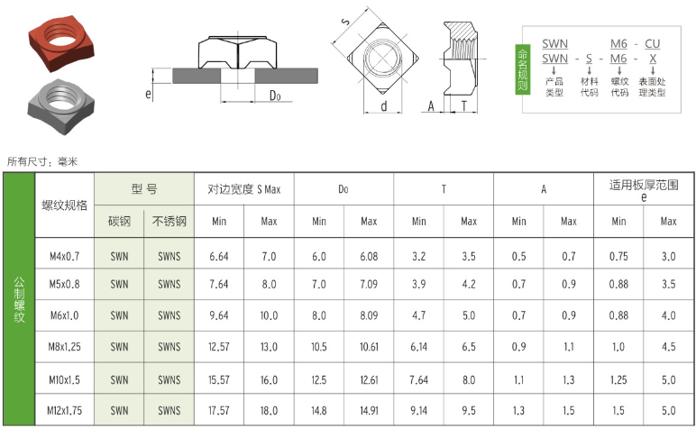 產(chǎn)品概述 四角外觀,一面和普通螺母一樣,另一面有四個(gè)焊點(diǎn)。焊點(diǎn)用于焊接。首先在母體上沖出定位孔,把螺母的凸臺(tái)定位在孔上面,然后使用點(diǎn)焊機(jī)把螺母焊接在母體上。