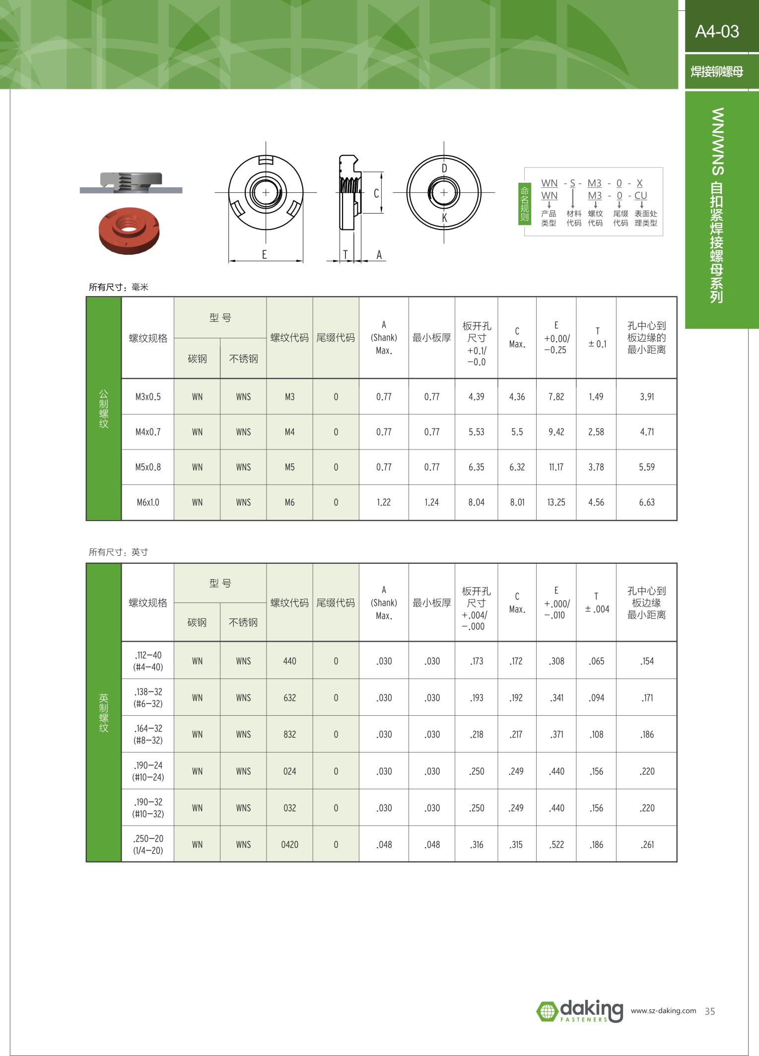 產(chǎn)品概述 自扣緊焊接螺母圓形外觀,一面和普通螺母一樣,另一面有三個(gè)焊點(diǎn)和一個(gè)凸臺(tái)。三個(gè)焊點(diǎn)用于焊接,凸臺(tái)用于定位。首先在母體上沖出定位孔,把螺母的凸臺(tái)定位在孔上面,然后使用點(diǎn)焊機(jī)把螺母焊接在母體上。自定位凸臺(tái)不僅正確定位螺母的位置,而且防止焊接飛濺,杜絕螺紋內(nèi)黏附焊渣。