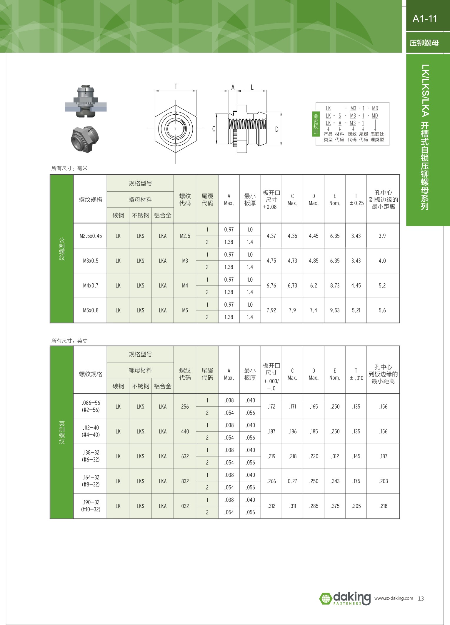 產(chǎn)品概述 LK/LKS/LKA 開(kāi)槽式自鎖壓鉚螺母,獨(dú)特的半圓弧2瓣峽口設(shè)計(jì),可以保證好的放松性能,同時(shí)可以重復(fù)使用,保持鎖緊力。