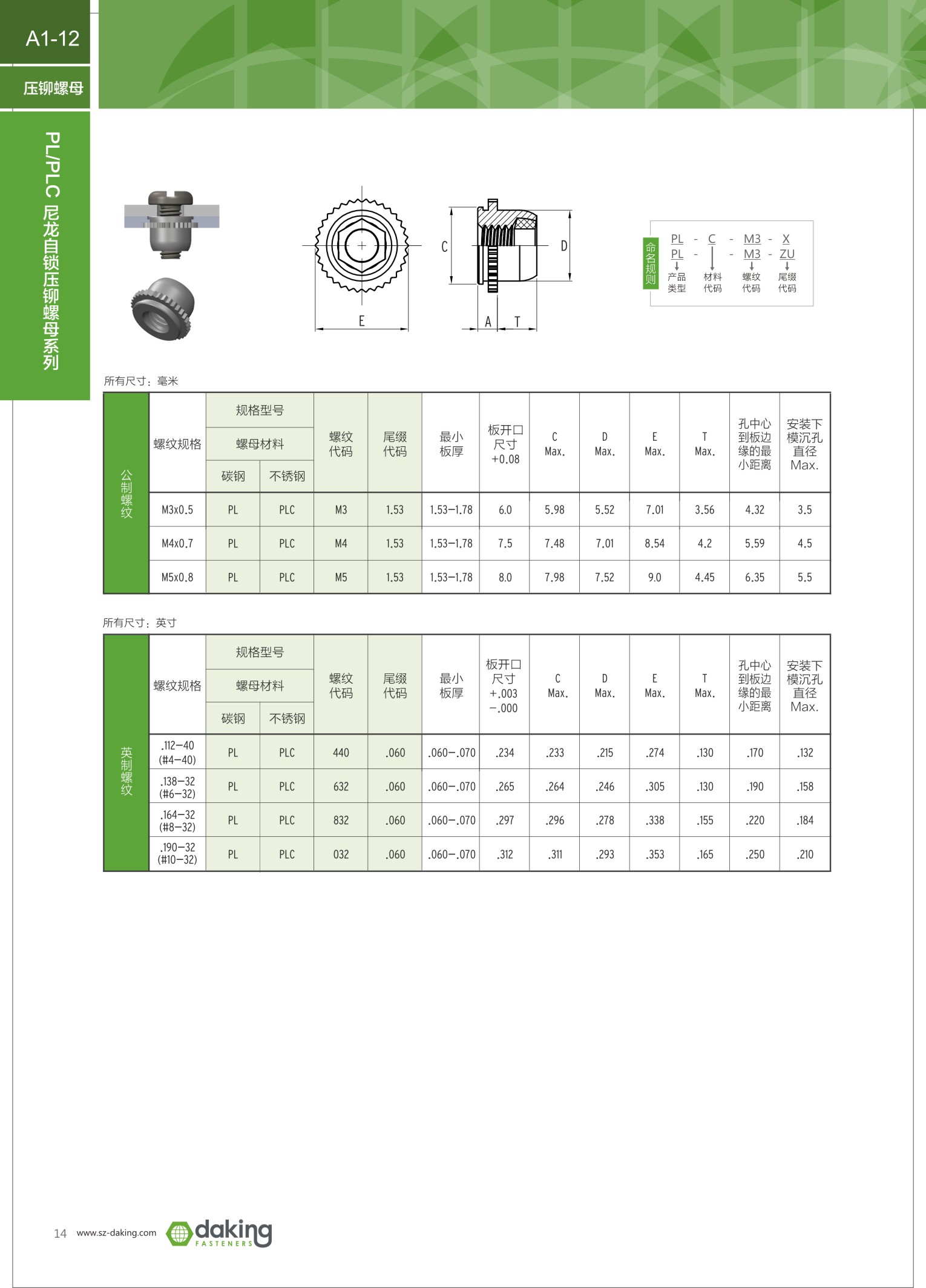 PL/PLC 尼龍自鎖壓鉚螺母,六角尼龍?zhí)峁┮粋€可以重復(fù)使用,非金屬的放松結(jié)構(gòu)。滾花結(jié)構(gòu)可以保證螺母和薄板的緊密連接。扭出力和推出力遠(yuǎn)遠(yuǎn)超過自鎖扭矩。