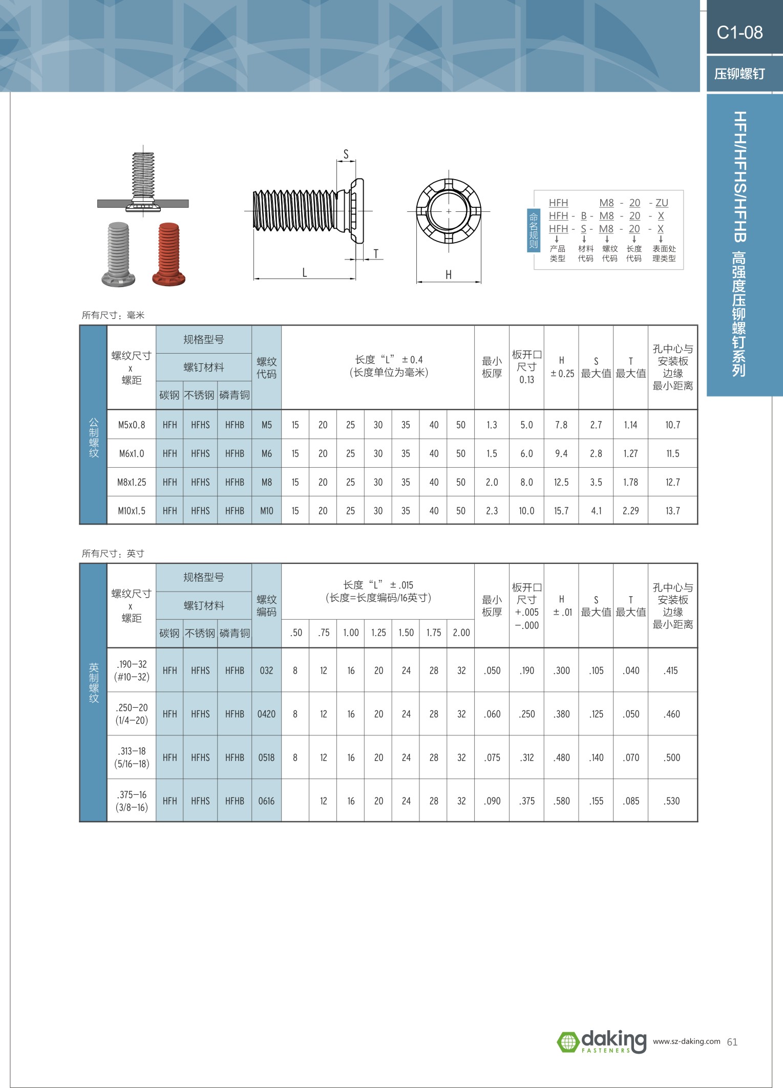 安裝簡(jiǎn)易且成本低廉,可以取代焊接螺栓。凸出板料的大尺寸螺栓頭部能承受強(qiáng)大的軸向緊固力從而有效提高了產(chǎn)品的抗拉性能。